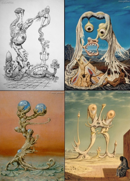 21 November 2015 The Dream Monsters Tarot by William Zierfus is a riot of eyes, amorphous bodies and bright colours. William Zierfus is a US writer and artist, who has written and illustrated a number of children's books and is probably influenced by the Dr. Seuss stories and illustrations. His "monsters" are far from scary. They are like blobs of protoplasmic lime, cherry and lemon jelly. They remind me of the early surrealistic paintings of Johfra (some decades before his more emblematic Zodiac Series). I am not sure if William Zierfus had seen these rather neglected paintings of Johfra Bosschart from the 1950s and early 60's, but if not he seems to have touched on much the same concept for his imagery.