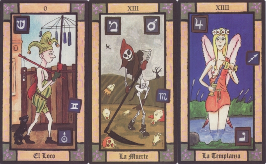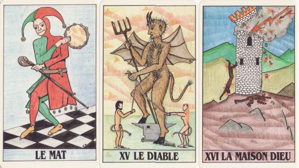 10 May 2011 I recently bought a Spanish tarot entitled Tharhots 1313. This is a conventional 22 card tarot which is provided with an extra set of 22 cards with short text cues to the meanings of the cards. The artwork is naive, and it appears to be by an untrained artist rather than someone attempting to mimic that style. They are simple line drawings in pen which have been coloured, with no modelling, using coloured pencil.