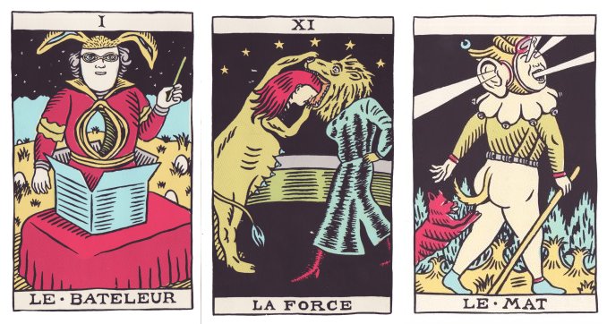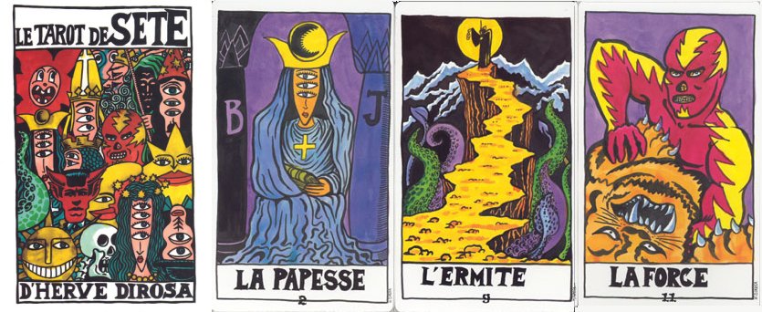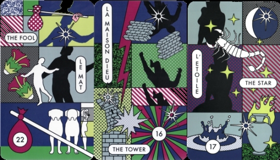 10 November 2015 Another tarot which arrived recently is the Spanish Tarot del Fuego by Richard Cavolo, published by Fournier and easily available. It is a complete riot of colour. No subtlety here, no restricted palette, just straight in-your-face saturated colour. Also, as with the Juicy Tarot from Taiwan I mentioned here a few days ago, Cavolo adopts a graphic device, here creating figures with multiple eyes. We have noticed this device also in the Tarot de Sete of Herve DiRosa, France 2004.