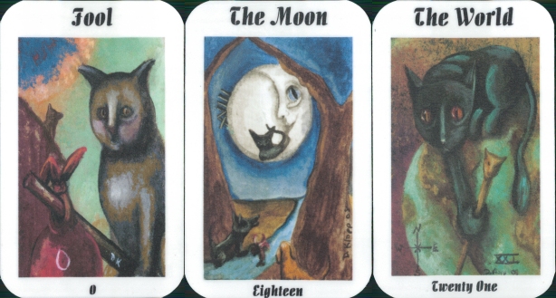 28 April 2014 The Black Cats Tarot from Lo Scarabeo arrived today. It is, of course, a 78 card deck in the familiar size and packaging. The artwork is by Maria Kurara and is created digitally but mimicing acrylic painting. Interestingly she shows the Fool as a white cat, and card XXI, the final card of the Majors, depicts a white cat emerging from a black cat suit, seemingly suggesting that a black cat is a white cat inside, a strange form of dualism.
