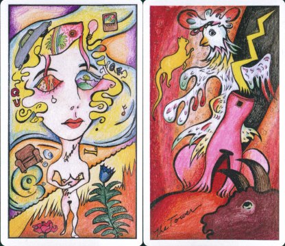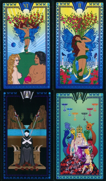 21 January 2011 I just discovered a wonderful tarot, O Tarot do Amor, issued with a book in Sao Paulo, Brazil, in 1995. The designs by Vinicius Pradella are quite amazing, being both creative and delightfully painted. The book is written by Eduardo Molinero. Pradella is a surrealist artist mostly working in oils with a considerable reputation. The cards are large allowing the details to be seen. You can see some of his other work here.