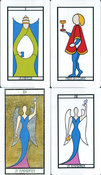 19 November 2015 In 1994 Marco Benedetti created a set of tarot images. The major arcana were set on a background of gold leaf with silver leaf also applied to some of the images. These were not printed at the time, but earlier this year he took advantage of the US based print on demand card producer The Gamecrafter to issue these as the Marco Benedetti Tarot. He reduces each figure to a series of simple beautifully drawn curves colouring them sparely with block colour with no modelling. The figures have no facial features. This abstraction seems to heighten their archetypal nature. His designs reflect the Art Deco style. This is a full 78 card deck with non-emblematic pip cards. I include one of his original major arcana paintings so we can see the design with the gold leaf background. Sadly The Gamecrafter does not print in gold ink otherwise I feel sure Marco Benedetti would have used this. This is a rather cool, detached yet archetypal set of images. You can buy copies from www.thegamecrafter.com