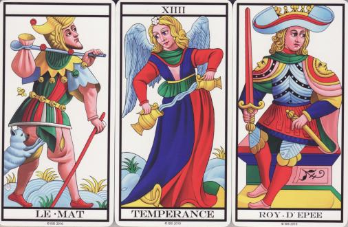 10 January 2011 I recently bought a copy of a French tarot from 1980, the Astrocards of Frederic Maisonblanche. It does not seem to be mentioned in Kaplan. The box contains two sets of cards, a tarot of Marseilles style deck with two extra cards, and a set of 12 astrological cards using images of the zodiac, which are larger than the tarot set. The tarot deck, at first glance appears to be a conventional tarot of Marseilles, but one quickly realises that the expressions of the faces are designed to subtly amuse.