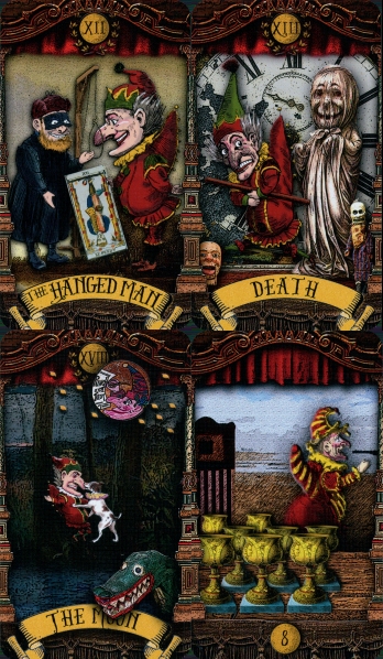 17 November 2015 I seem to remember that Mr Punch has made an appearance in some tarot decks, but here he asserts himself with a tarot deck entirely devoted to himself. This is the Tragically Comic or Comically Tragic Tarot of Mister Punch issued by Duck Soup Productions. The artwork is by Douglas Thornsjo, and we have seen his work before in the 2013 Tarot of the Zirkus Magi, where he adopts a deeply saturated palette of colours and mimics late 19th and early 20th century vaudeville posters and giving these a deliciously humorous twist.