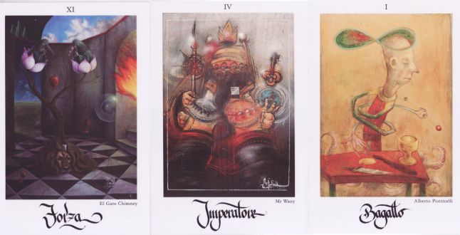 21 December 2010 I just bought a tarot based on an exhibition that opened in May 2009 at the Il Vicolo gallery in Cesena in Italy. This was entitled Il Diavolo & l'Acquasanta Tarocchi Fantastici and seems to have been a grand affair involving various cultural figures in that region of Italy. The artwork is modern and about half of the pieces were sculpture, and half are paintings, photographs and collage.