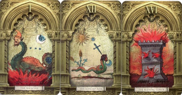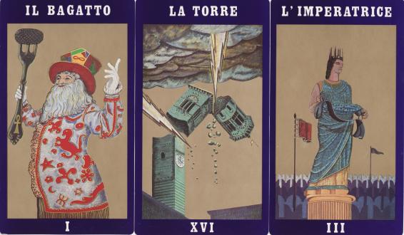 15 December 2010 Some years ago I saw some images of this tarot, the Tarocchi di Verona, but I cannot remember where. However, I recently was able to buy a copy, but now cannot find out anything about it. It seems to rely, for some of the card imagery, on various architectural monuments in Verona. The backgrounds are printed in a matt gold ink.