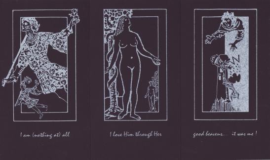 18 May 2011 I recently received some tarots issued with the Femme Actuelle magazine some years ago. One of these, entitled Le Tarot du Cosmos, turns out to be a small version of Le Tarot de l'Ange Liberté which was a series of remarkable paintings by Myrrha based on poems of Victor Hugo. Seeing these again I wanted to search out some more information about the artist, and I found a web page in French which gives quite a clear picture of Myrrha. These artworks are rather impressive pieces and I noticed that three of them quote symbolically from the 16th century alchemical manuscript Splendor Solis, which shows, as part of its sequence of images, a series of symbolic events taking place in flasks. Myrrha reworks these into card 12, 13 and 15.