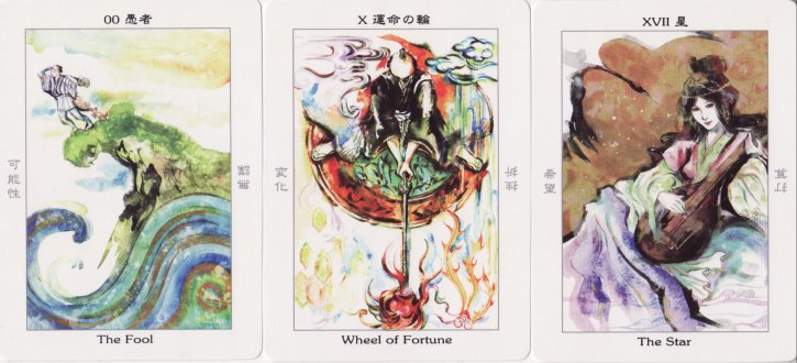 16 December 2010 I have just received a Japanese tarot called the Kojiki Tarot designed by Seiko Kisaki. Kojiki is an ancient Japanese mythological text with poems and songs telling of the creation of the Universe and stories of the Gods and Goddesses that shaped it. This dates from the early 8th century and was composed by Ono Yasumaro by Imperial request. The Kojiki records the mythological origin of the four home islands of Japan, and the Kami or Shinto spirits. The myths contained in the Kojiki are part of the inspiration behind Shinto practices and myths. This tarot comes with a little booklet with some description of how each card corresponds to some god or goddess.
