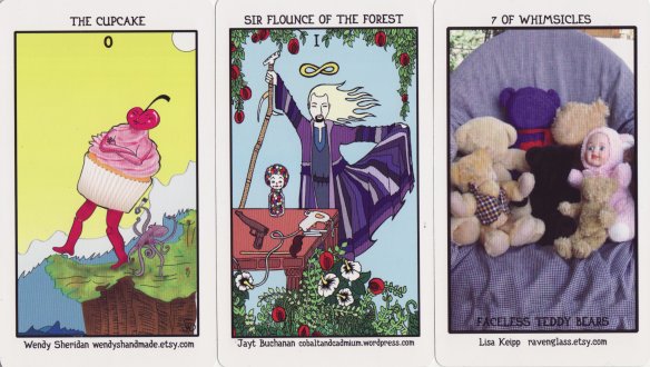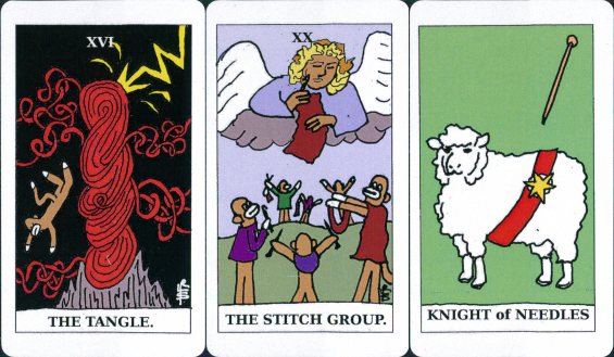 25 June 2014 There are some strangely themed tarots out there ! I have recently acquired the Purl's Yarn Emporium tarot with its theme of knitting and wool. There is actually already a Knitting tarot issued in 2005 which luckily I also have. I suppose the Purl's Yarn Emporium tarot is intended as a promotional for their shop in Ashville, North Carolina, which sells wool and all the necessities for knitting. Naturally, the imagery is not without its delightful humour.