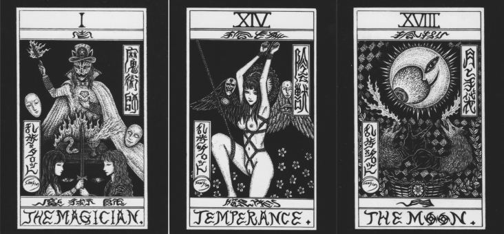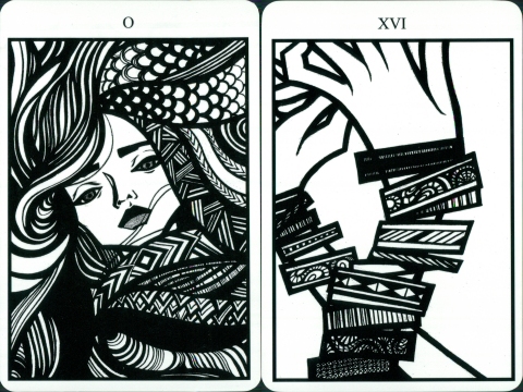 30 August 2010 I recently managed to get a copy of a black and white tarot by the Japanese artist Masahiro Obara, to which a fellow collector had alterted me. They look like woodblock prints, but I suspect they have been created using pen and ink. They appear only to be available from a store in Japan where the designer, who is aslo a tarot reader, goes once a week to read fortunes. The cards are quite expensive, but this is one which, because of the unusual style of the artwork, will greatly appreciate in value once the edition is sold out. I bought two copies.