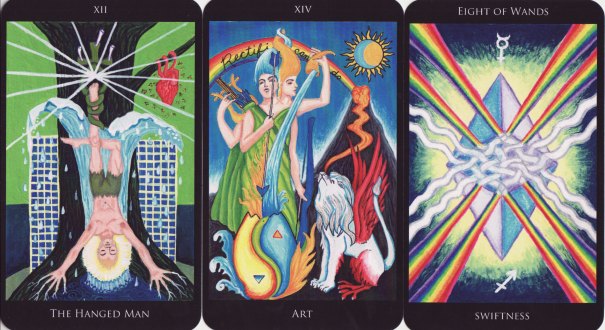 3 April 2014 Erik K. Lerner created the artwork for the Radiant Spleen Tarot in 2004 but has only now been able to publish it. It is a 22 card deck with large cards supplied in a box. The thin transparent colours are printed onto gold surfaced card to produce a delicious radiant effect.
