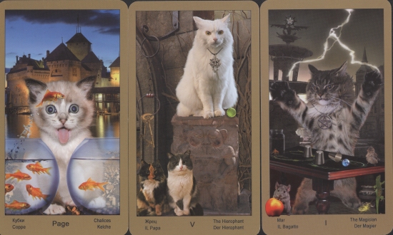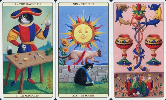 23 April 2014 With great felicity, today I added another cat tarot to my collection. The illustrator Christian Gaudin has produced for the French publisher Relie an extensive series of books on a cat theme - Yoga for Cats, Zen for Cats, Kama Sutra for Cats, and now Le tarot des Chats. Supplied in a well constructed box with a book written by Alejandro Jodorowsky the well known filmmaker, author and great enthusiast for tarot.
