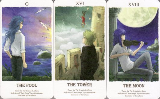 11 November 2015 The Blue Tea Tarot from Hong Kong is a bit of a puzzle for me. It is a collaborative deck produced in the name of the Blue Tea College, which appears to be some kind of game, manga, graphic novel or television show - I cannot tell as I do not read Chinese, and Google translate is not very good on Chinese. It even has a Facebook page, but that does not throw further light for me on what this tarot is about. Anyway the artwork by a number of different artists is rather fine and it makes a nice production coming in a box with a beautifully printed book. It is likely to be the creation of a doujin or group of fans I detect a certain resonance with Harry Potter and Hogwarts, but I may be reading this into the imagery. It is difficult sometimes when one can only view images and be unable to read the text. Any help in explaining what the Blue Tea College is about will be gratefully received by this puzzled collector of tarot, who is a little bit remote (to understate the obvious) from young Chinese peoples' culture.