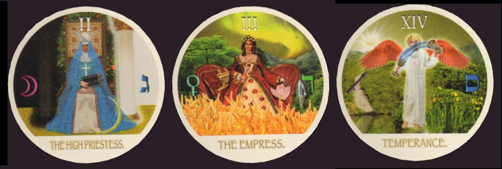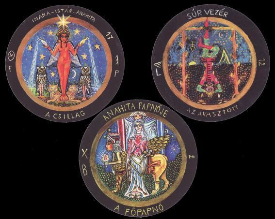 13 December 2010 There is something quite delightful about round tarots. The first appears to be the Nature Tarot issued in Japan in 1980. Many feminist inspired tarots then emerged in the 1980s using the round format, and it is now an established style. I recently obtained, through the good offices of a tarot dealer in Los Angeles, the Sumeremilhun Tarot issued by Emil Kazanlar in 2002 in Hungary. The cards designs take inspiration from Sumerian bas-reliefs and some Byzantine manuscripts. They appear to have been created in gouache. Kazanlar is, of course, best known for the tarot he produced in 1996 published by AGM Müller.