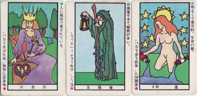 28 April 2011 Ryuji Kagami is a well known author of books on astrology and fortune telling. He has been involved in the design of a number of tarot decks. I recently bought a copy of a magazine from 2004 published by Shogakuka, which contains a cut out gift tarot entitled One Oracle or the Good Luck Tarot. The artwork though simple presents a stylish set of designs, somewhat similar to that os the Soulful Tarot, 2005 which he designed in collaboration with Yoshitaka Yasumatsu. This One Oracle tarot was a little bit more expensive as it is by a well known tarot designer and was intact inside a seven year old magazine.