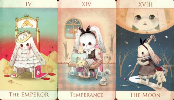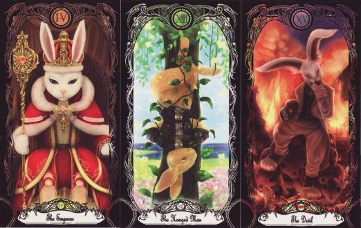 4 May 2011 It was foxes a few days ago, now its rabbits and hopefully in a few weeks it will be even more penguins. The Canadian artist illustrator Jessica Clayman has now produced the Twilight Rabbit Tarot, which she sells through Etsy and on her website www.twilightrabbit.com, is a full 78 card deck, with emblematic pips, which do not follow the Pamela Colman Smith images. Here the four suits are rabbit oriented, Clover, Passions, Carrots and Stone. The cards have a stylised frame and the artwork is digitally created with the outlines perhaps drawn first in pen.