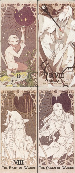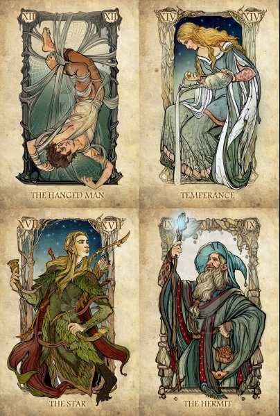 9 November 2015 This Lord of the Rings themed deck by Russian artist SceithAilm on Deviantart is well known, with its images currently available on many web pages, but it is very worthy of being mentioned again here. In her work , which seems primarily driven by fantasy art, she uses both traditional drawing and digital methods. Her line work is exquisite with beautifully formed smooth curves such as we note in her Hanged Man, Temperance and others. I suppose one could not expect these images to be published in printed form, due to copyright implications conflicting with the current film version mechandising, but at least, with its presence on so many web sites, it will survive in the digital public space. It is well worth taking a look at her other work. sceithailm.deviantart.com/gallery/