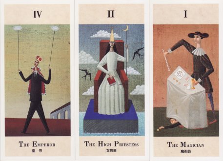 2 July 2014 I recently obtained a copy of the Taimei Tarot through the well known dealer BabyDream. This is a majors deck with the original artwork by Takahiro Imai, Hiroki Kakinuma, Maiko Kitagawa, and Kaori Tamura, exhibited in December 2012 at the Taimei Gallery in Tokyo. Takahiro Imai and Hiroki Kakinuma work in oils. Maiko Kitagawa and Kaori Tamura work in pen and tempera. It has beautiful detailed imagery.