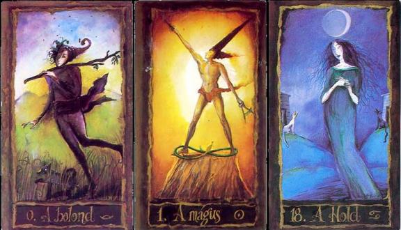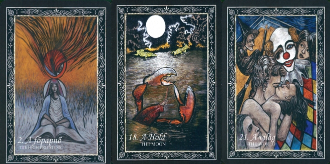 23 January 2011 Another Hungarian Tarot I recently obtained is the Bharat/Nagy Tarot, a majors only deck created by Joshi Bharat and Laszlo Nagy in 1992. They adopt a style based on the Rider Waite, and mimic, using a number of graphic techniques, its line drawn woodcut style and the flat areas of colour tones used in the screen printing. In many places they depart from the standard imagery, for example the Tower and the Moon, while cards such as the Magician adhere closely to the Pamela Colman Smith designs. The cards are covered with a reticulated or textured lamination.