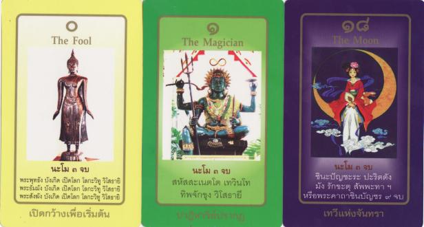 26 September 2010 I have now had to bud off another archive, the fourth, for the weblog, in order to reduce the time required for the browsers to build the page. The archives now amount to over half a megabyte of text and 44 megabytes of images ! 26 September 2010 In my entry on this weblog for 3 June 2008 I showed a Buddhist tarot from Thailand. I have now managed to obtain another Thai Buddhist Tarot. This is based on photographs of Buddhist artwork, both paintings and sculpture. Each card has a different coloured background.