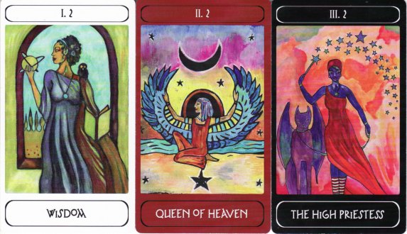 25 November 2015 The Lilith Bible Tarot, created by Lorelei Douglas, seems to be an attempt to recontextualise Christianity within a wider pagan and female centred mythology, drawing on Jewish and Egyptian elements. I cannot immediately grasp many of the reworkings within the imagery, I suppose I must wait for an explanatory book. The previously obscure Lilith myth become popularised in the late 20th century as it resonated with the then emerging feminist critique of religion. This tarot seems to work within this emergent myth. Lilith appears on the Lovers card, with Adam and Eve in the foreground. Here she is identified with the serpent on the tree, and we see her in the same role as the High Priestess. One would have to be relatively well read in Christian and Jewish mythology to grasp the meaning of many of the Major arcana within this system, though the Minors to a great extent follow the Pamela Colman Smith prototype. The artwork is a composite of line drawings with collaged elements, probably built up in layers using software like Photoshop.
