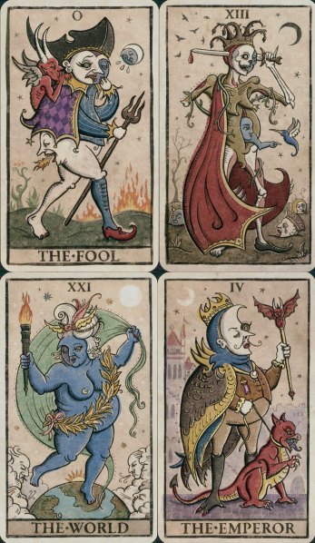 5 August 2014 Bethalynne Bajema has now produced a third tarot. I first came across her work, the Sepia Stains Tarot, in 2010 before she had finalised it for printing and I was able to buy one of the 10 prototype decks. A year later she issued the Black Ibis Tarot, consisting of posed photographs of models, primarily female, wearing goth or retro clothes, with collaged headresses and some other elements. Now she has published the Isodore Tarot, subtitled "A Neo-Victorian tarot deck". This is named after the illustrator and caricaturist Jean Ignace Isidore Gerard Grandville (1803-47). Bethalynne Bajema has collaged images from Grandville's animal series and creatively reworked these into complex tableau. Supplied in a tin box. She has a great talent at digital collage. The deck is beautifully printed in offset lithography with the top black layer being printed in an ink containing some varnish which makes it stand out in relief on top of the background colour - a rather fine effect.