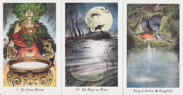11 May 2011 I finally got round to buying a copy of the Wild Wood Tarot by Mark Ryan and John Matthews. It had been out for a few months but a mass market tarot such as this will be around for some years, so I had not rushed to buy it. I am so glad I did. The artwork by Will Worthington is marvellous. He has already produced fine artwork for other tarots and sets of oracle cards, but in this deck he truly surpasses all his previous work. Each design is meticulously draw in fine pen line then coloured with water based colour. He applies many layers of different, though related, colours to build up a texture, depth of tone and saturation to key areas of the images. His rendering of birds and animals is a delight. Compared with some other mass market decks whose artwork is flat and dead, here each image is alive and its visual space full of life. Just look at his depiction of water below the Kingfisher. The original paintings would be well worth collecting if ever they came onto the market.