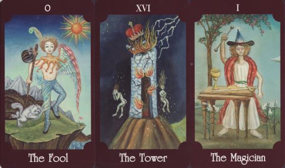 29 April 2011 I recently obtained a copy of the Fox Tarot by Mary Hoy, sold through her Cageddreams.com. Mary Hoy works primarily in the digital medium. This is a full 78 card deck, professionally printed and supplied in a transparent plastic box. The minors do not copy the Pamela Colman Smith imagery. Mary Hoy produces some wonderfully cute depictions. Strength is particularly amusing, with a fox stroking a rabbit (in place of the usual lion) entirely inverting reality.
