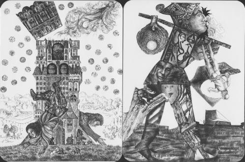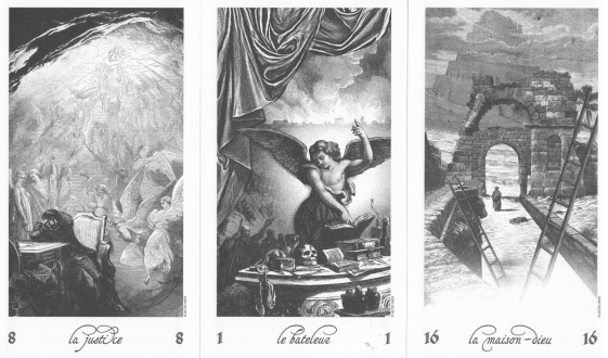 1 October 2010 I often say that there is little point in studying tarot art from fuzzy jpegs from web sites, and that nothing can approach having the actual physical cards in hand. This is especially exemplified by the Tarot de Jean-Luc Bonicel. Published in 1986, this must be among the best of collage tarots. For his source material Bonicel used fine line engraving, probably steel engravings from the 19th and early 20th century. These have extremely fine lines with almost no softness to the edges. He uses hundreds of individual components to make up each card. I expect these were photographed on a litho process camera on a large negative which then was corrected and any edges of the paper layers stopped out. The result is some amazingly complex collaged images. When scanned and jpeged all of the crispness is lost and one only has a fuzzy, muddy mess to look at. This is an expensive tarot but well worth the price. It is at the summit of what can be achieved in black and white collage though only owners of an actual deck will appreciate this.