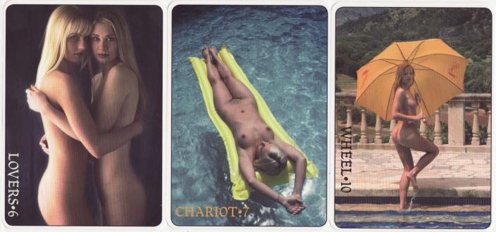 28 September 2010 The Tarot Feminine is a bit of amusement from Australia in the style of pin-up or erotic playing cards. Nothing pornographic, indeed these photographs are the sort of images one sees in established publications. Nothing much erotic, and nothing much of tarot imagery either. One can see small hints in the "Majors" but nothing in the "Minors". Here we are at the outer limits of tarot when its imagery is almost dissolved away. Only those striving for completion and an exhaustive collection would think to buy this deck.