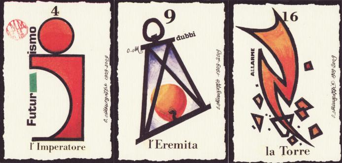 1 June 2011 There are a number of tarots inspired by H.P. Lovecraft's invented magical book written by the "Mad Arab" Abdul Alhazred. I just obtained the Tarot Necronómico issued with a book by J. Fernando Pérez-Vigo at Madrid in 1992. 31 May 2011 I still have a pile of tarots to bring to your attention through this weblog, but my time is limited by other commitements. I recently received the Tarocchi Futurismo created by Osvaldo Menegazzi. In this he celebrates the art movement of the early decades of the 20th Century, Italian Futurism, created by Filippo Tommaso Marinetti. A number of artists were linked to this movement. Menegazzi draws on the paintings and graphics of Marinetti and Giacomo Balla with their bold and jarring shapes mixed with fragmented typography.
