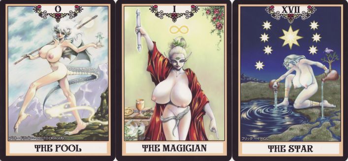 21 July 2010 I recently got a copy of the Orgasm Tarot from Japan. It seems to be produced by an erotic manga artist/publisher called Koh Soramoto. I must say I found this very amusing and not at all erotic. The artist is totally obsessed with large breasts. Every figure in the tarot is depicted with such large breasts as to be ridiculous. It is obviously a parody probably referencing images from well known mangas. This is well worth buying, if you can find it, as a novelty. It was self-published as a doujinshi in 2005 so may now be difficult to source. This is the sort of novelty tarot that will appreciate in value once it is impossible to find. Don't pass up any opportunity to buy this.