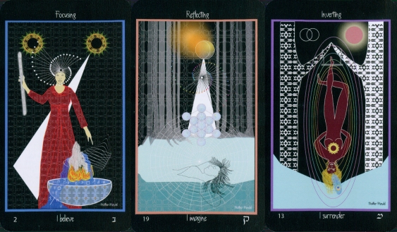 11 July 2014 Many years ago I found the strange Greek word 'syzygy' when reading some of the Gnostic texts. Some of these conceived of their gods being in opposed pairs or syzygies. It was also used in astrology to describe the opposition and conjunction of planets, Sun and Moon. The word was adopted by Jung and the Jungians who decontextualised it and somewhat modified the meaning. Now Heather Mendel has created her Syzygy Oracle which, rather than being an unstructured set of cards, is a 22 card Majors deck together with 10 sephiroth cards. Mendel uses kaleidoscopic mandalas, fractals and sacred geometric designs. Underlying her imagery is a kabbalistic system. The 22 majors are numbered 1-22 rather than 0-21. They are renamed but entirely reflect the tarot imagery. The ten sephiroth cards are in the form of circular mandalas like kaleidoscopes. It was created using a vector graphics drawing program.