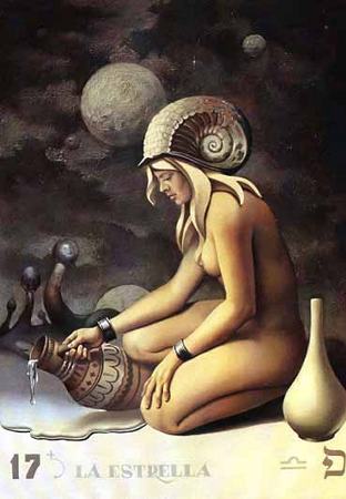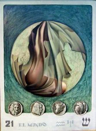 15th Aug 2007 Today, by serendipity, when searching for something on the internet, I discovered an amazing series of tarot paintings by an obscure Italian surrealist artist, Vito Campanella, now living in Argentina. Campanella was born in 1932 in Italy, and was educated at the Academy of Fine Arts in Milan. He studied with Giorgio de Chirico for two years and for eight months with Salvador Dali. His tarot paintings were made around 1981 but I am not sure if he completed the full set of 22 majors. The paintings seem to have been intended to be used as designs for an actual deck as they have the title, number, astrological symbol and Hebrew letter in a panel at the bottom. I have been able to find images of only two of the cards, the Star and the World, but will try and research further into this amazing artist.