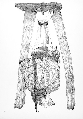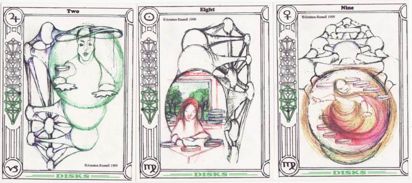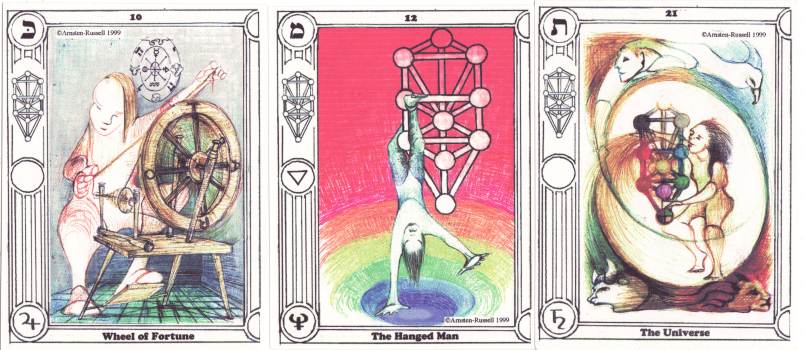 4th July 2007 On my weblog entry for 28th June 2007 I told of a series of drawings of the tarot majors by the Italian artist Nicolo d'Alessandro which were printed in a book Disegnare non stanca. Tarocchi e altre figure Sellerio, 2002. Today I received a copy of this book. The images are incredibly detailed drawings reproduced large size in this 9.5 by 8.5 inch art book. It is well worth buying a copy while it is still available. 3rd July 2007 There are quite a number of tarot decks based on the Kabbalah. This is partly explained by the happy coincidence of there being 22 tarot trumps and 22 paths on the Kabbalistic Tree of Life. I recently acquired, at considerable expense, the remaining prototype of the unpublished Kabbalist's Tarot created in 1999 by the american artist Susan Arnsten-Russell. Using delicate coloured pencil she has created a tarot strongly based on kabbalistic ideas. Each of the 78 cards bears a frame, on the left side of which is a tree of life glyph with the relevant 'path' coloured in gray. The Wheel of Fortune is rather fine, using the image of the spinning wheel. ![]() For her minor arcana, she uses the extended Tree of Life as first codified by Warren Kenton (Z'ev ben Shimon Halevi), in the left side of the frame. This codes to the four traditional elements (and thus the tarot suits) with the ten sephiroth (the pip cards) for that respective element and four courts to key sephiroth. It might seem a complex abstract system, but it is at root quite simple. Her designs for the pips are remarkable in that she shows the Tree of life from different perspectives with the image she has created for this card (based on the emblematic imagery used in the Rider-Waite minors) shown on its sephira which is brought to the foreground through the perspective. It is a truly remarkable effect. This is one amazing set of tarot designs.