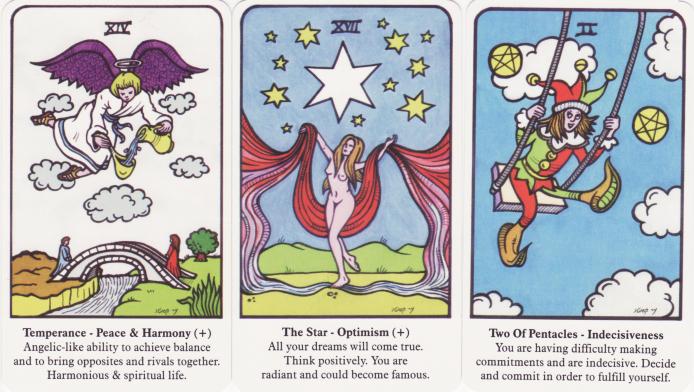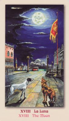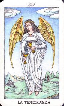 3rd Aug 2007 Few tarot decks seem to have emerged out of Israel. Up till now the only one I have known is the Sakki-Sakki Tarot, but recently a new deck has appeared now called the Tell me tarot though originally published under another name, created by Arik Eyal with the artwork by Nir Kasuto. This, surprisingly, comes packaged in a large diameter cardboard cylinder. The deck is not quite a Rider-Waite clone, but rather it mimics the style, and creates some new envisagings of the cards. The name refers to the fact that each card has a sentence or two interpreting the image. Thus The Fool has the keyword 'Trust' and the text "Trust your inner voice and let yourself go towards the unknown, free of worry and fear". ![]() Temperance has the rather fine addition of the bridge over which the male and female figure are seen crossing. The Star nicely merges the red flowing robe with the river on which the figure stands. I show the Two of Pentacles beause it is such a fun image. 31st July 2007 Venice is popular with tarot artists, because of its cultural elements, such as the Carneval and Masquerades. I have a few Venice related tarots - Folchi's Tarocco del Carnevale di Venezia, Collete Silvestre's l'Oracle de Venise, Ricca's Venetian Historical Tarot, Gianni Predieri's I Tarocchi Veneziani (designs in book) and the Tarots of Casanova. Now I have just received Dal Negro's recent publication the Tarocchi di Venezia by Davide Tonato.These are quite big cards 160 by 85mm (5.8 by 3.3 inches), so would probably not be very acceptable for readers who seem to prefer standard size decks. They are on a thin stock. As to the artwork, they have well drawn detailed backgrounds often in a muted pallette of the canals and buildings of Venice, with a strongly coloured foreground figure. The emblematic minor cards make reference to the familiar Rider-Waite, though do not slavishly follow that convention. The well known Venetian masks do appear in some of the imagery, but do not dominate. Instead the City of Venice with its architecture and the culture of canal life is celebrated as the main theme. The Moon card is wonderfully evocative. 30th July 2007 David Higgins' A Sacred Isle Tarot arrived today. This tarot is a delight, consisting of wonderfully detailed artwork, printed in nicely saturated and vibrant colours, which is offset by the plain black border. The cards are of the standard size (120x65mm) and printed on a thin stock. The imagery is for the most part quite conventional, with a slight departure from the familiar imagery in the Death, The Moon and the Sun cards. The sheer quality of the artwork shines out in this Majors only deck. I understand a full deck is in preparation. My certificate of authenticity has assigned me no 20 of an edition of 1000. David Higgins is certainly an optimist ! I would not expect a self-publisher ever to shift 1000 copies. I hope he has not printed all 1000, as he might be storing a large part of those for some time ahead.