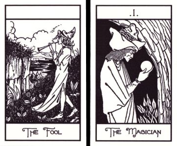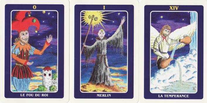 13th May 2007 I have just received a rather fine Italian art tarot produced in 1998 in a limited edition, which seems to be completely unknown outside Italy. This Tarocchi d'Arte Il Sole Inchiostro is a majors only black and white deck, made in indian ink applied by pen and brush. The artwork is a delight with its flowing forms and its creative realisation of many of the arcana. The Tower is often difficult to rework, but here the artist Linda Zanier has found a new image, which still retains the classical idea of the tower. ![]() ![]() I am so impressed by this deck that I have decided to buy some of the few remaining copies and sell these on to fellow collectors on my mailing list. It is rather wonderful to discover such a fine art tarot. 11th May 2007 A few days ago I bought one of those mystery tarot decks that I did not immediately recognise and was incompletely described, but I bought on spec. It arrived today and is quite intriguing. It is a majors only deck with French titles on the Arthurian theme. The cards are for the most part renamed yet the imagery of the arcana remains clear. Thus the Magician is 'Merlin', The Priestess is 'La Dame du Lac', The Empress 'Guenievre', The Emperor 'Arthur' and so on. There are 23 cards in all with an additional card numbered '22' being named 'L’Ego'. It is possibly one of those decks given away free in a magazine. I would like to be able to identify it, so I will post a note onto the Aeclectic Forum. No doubt someone there will have seen it.