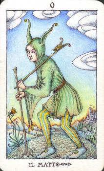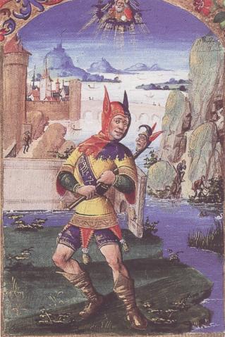 24th July 2007 I have been rather busy recently setting up my art exhibition on alchemy in Edinburgh, but today I found this interesting illustration from a Parisian Breviary from 1470, which is in the Bibliotheque l'Arsenal in Paris (MS. 101). It is a quite wonderful image of a fool. In its conception, of course, it had no connection to the tarot, but it is the kind of image that artists today often draw on for inspiration in creating a tarot deck.