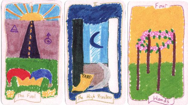23rd Oct 2007 Tarots often come with strange names, but here is one of the lengthiest and most amusing, The Genius and Very Bright too Also Tarot. It is not just a tarot with a unique name, but also takes the very unusual stance of not depicting a single human figure. There are a few cats, a rabbit, some birds and even a snail, but no human figures. The deck is based on the Rider Waite with the pips being emblematised following the imagery there, but minus the humans. The artwork by Tracy Smith is created using felt tip or coloured marker pens, and is in a naive style, somewhat like Cheryl Carlyle's work. Such items are the often unrecognised treasures of modern tarot.
