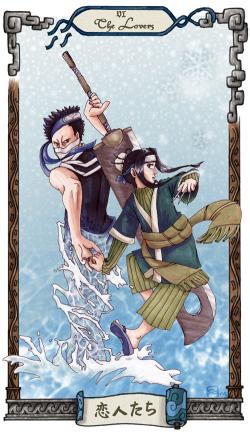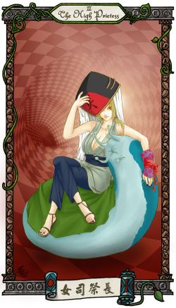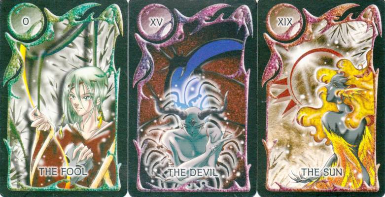 19th July 2007 On 22th May 2007, I had a little rant about the Lo Scarabeo Tarot of the Elves. Usually I buy the Lo Scarabeo decks from Alida as soon as they come out, but I now find myself hesitating. The decks they are now producing seem to me so contrived as to lack integrity. Today the African American Tarot arrived. It seems total nonsense to me. A strange fantastical sweet confection which supposedly celebrates African American culture. What we are given is a Rider Haggard inspired colonial view of tribal African culture. The 'American' component of the art work is seen only on the pip cards as ghostly tableau in the background, picturing the achievements of mostly 19th and early 20th century Americans, to a great extent unknown to me. I wonder how many younger African Americans would know more than a handful of these figures. I am not African American, but UK Scottish, and I found this deck patronising and presenting an entirely unrecognisable view of Afro-American culture. Please, Lo Scarabeo, please do not do a Scottish tarot, as I might collapse under the weight of bagpipes, kilts, tartan, shortbread, spirtles, sgian dubhs, and sporrans. Someone, please tell them to get back to some real honest artwork. 18th July 2007 I just bought the Naruto Doujin Tarot Cards, produced in Canada by the 'Studio in Labour', a doujin (group of enthusiasts) for the popular anime and manga series Naruto created by Masashi Kishimoto. The designs, which I understand were created by four different artist, are very detailed and highly polished. It is a majors only deck. Though being created by four different artists, their artwork entirely coheres, unlike many other collaborative decks where little attempt is made to integrate the artwork styles. You can buy them direct from their website Studio in Labour. The cardboard box in which they are supplied is in brown card with cut out shapes probably created using a laser - a rather fine effect.