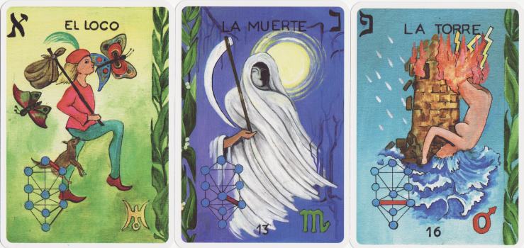 14th Aug 2007 By happenchance another Spanish tarot has arrived, the Tarot Adonay. This is the creation of Rossana Lara, styled 'Profesora Rossana', who is a writer on metaphysical and parascientific subjects. It was produced in 2005 in Barcelona. The artwork, which appears to be oil or acrylic paintings on canvas or canvas textured boards, is by Amparo Capell. This is a Majors only deck and each card bears a Hebrew letter, a planetary or zodiacal symbol, and a tree of life glyph with the path associated with the card being emphasised in red. The imagery is quite straightforward and the artwork style though simple is effective. The artist has opted to outline the forms with a thin black line, something less than common with oil paintings. Some of the images are especially memorable. I did respond to the tower, where the hair of the falling woman figure, seems almost to metamorphose into the waves of the sea below. La Muerte wears a white robe, which perhaps is unusual, and who could find fault with the jolly innocent Fool. This is not a mass market deck, and was probably produced as a publicity item for the Profesora, so buy a copy if you can, as it might not be easy to find in a few years time.