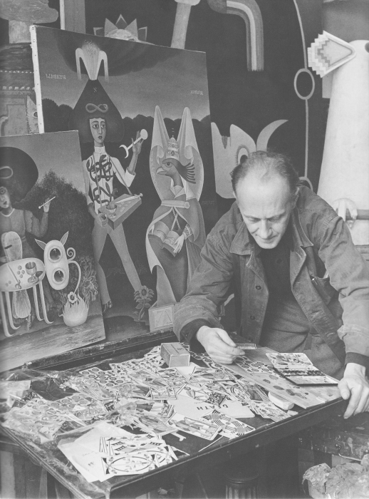 11th July 2007 I am afraid I am a bit of an outsider to the tarot mainstream as I am only interested in tarot as a modern art form. I have absolutely zero interest in reading, and very little in the meaning of the cards, except where this has informed the artistic work. For me, modern tarot artwork reflects and documents aspects of our culture, and this is what enthuses and engages me. I have written a study course on the artwork of modern tarot and am also hoping, in the longer term, to create an exhibition that would reveal tarot as art. I have collected over 1500 tarots, and have hundreds more in the form of scans, and I try to keep up with all the new developments. I suppose one can see me primarily as an art historian, though my colleagues view my interest in tarot as strange and almost perverse. People who view my work always ask me the 'T' question - "Do you Tell fortunes, then!", so I have an uphill struggle trying to get them to view tarot as artwork. Usually half an hour or so sitting at a table and showing them various decks and designs and placing these in some context and I begin to convince them that my strange hobby has some value - at least that is what they say to me! Though when my back is turned they may be a bit less sympathetic. Sadly, modern tarot art is ignored by art historians, galleries and musaeums, but it will eventually become recognised as a part of our cultural heritage - at least that is how I justify to myself spending large sums on particularly rare or important tarots. 10th July 2007 The surrealist artist Victor Brauner, who was born in Romania in 1903 and died in Paris in 1966, was very influenced by the emblematic imagery of alchemy and tarot. Today I found this interesting photograph of Brauner taken in his studio in Paris in 1948, showing him looking at tarot cards, while behind him is seen two of his paintings directly reflecting tarot imagery - on the left L'Surrealiste and in the centre Les Amoureaux, both painted in 1947.