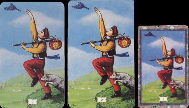 18th Oct 2007 I don't usually collect Jeu de Tarot, those French decks used to play the card game, but every now and again a deck in this style appears which has its twently two trumps reflect the tarot imagery. A deck has recently appeared for the game of Troccas which is apparently still popular in some parts of Switzerland. This game seems to be known in Japan as this deck the Nakayoshi-Mura Tarot is a souvenir of the 1000th meeting in 2006 of the Nakayoshi-Mura Club (in English, "Friendly-Village"), a game-club specializing in traditional games, Tarock, Uno, Chess. etc. I obtained this deck through the good offices of a fellow collector in Japan. The pips and court cards are conventional, but the majors are rather fine. As with all the game decks, the majors or, rather, trumps, are printed with a mirrored image, so that players do not give away to their opponents the fact that they have a trump if they turn it upright.