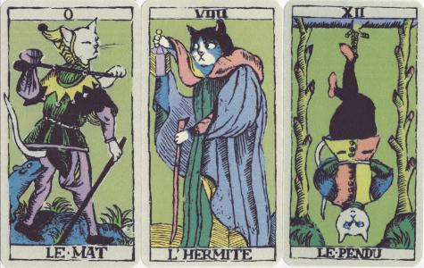 Sadly this happens with many tarots. Even just after a mere handful of years, contact with the artist or original publisher of some interesting deck is lost so there is no chance of being able to publish an edition. There are many interesting tarots existing as artwork designs - just take a short glance through Kaplan Vol III or IV - and yet it is impossible any more to locate the artist or publisher. 16th July 2007 Today the Carot Cards arrived from Japan, thanks to the kindness of a Japanese member of the Aeclectic Tarot Forum. No this is not a carrot tarot! though amazingly there is an unpublished tarot deck, the Uncarrot Tarot, which actually has nothing to do with carrots either ! The Carot Cards are a recreation of the familiar Tarot de Marseilles majors with cats instead of human figures. The artwork is by Yoko Imamura and was published by the Katsumi Art Studio in 2006. I have lost count of the number of cat based tarots that I have in my collection, though it must be at least 20, and I am sure that this is a theme that has not yet exhausted tarot artists. These cards are printed in a muted and restricted colour pallette that is shifted towards greens and blues, a rather unusual but stylish approach, that discriminates them from the usually brightly coloured Marseilles cards.
