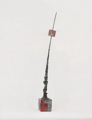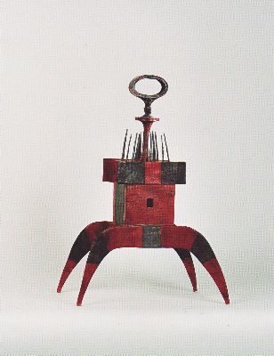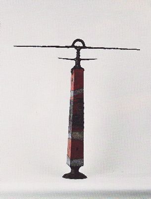 24th Aug 2007 I am always on the look out for tarot artwork produced by established artists. Last weekend, by total accident I found a little catalogue of an exhibition held in 1993, when searching for another item in the inventory of a Paris secondhand bookdealer. The catalogue was entitled 22 Lames du Tarot - not much to go on - but the dealer was kind enough to send me some scans of a couple of pages and I immediately bought the catalogue, which arrived today. This includes photographs of a series of bronze sculptures based on the tarot. These were made by Claude Cehes, a woman artist, born in Algeria in 1949 and now based in France. She has become a well respected sculptress and her works have been bought by major state institutions and numerous French and foreign private collectors. Many of her sculptures are quite small, indeed miniatures, but the items in her tarot series are up to a metre (3ft) tall. These are not figurative sculptures but instead she has isolated and abstracted a feature of the tarot arcana and modelled that in clay which was then cast into bronze. She then patinates the bronzes using only two (sometimes three) colours - a dark conventional bronze patina, an earthy red (like red lead) and a more silvery colour. These colours allow the forms to emerge from the surfaces. Thus for her Magician Le Bateleur she focuses on the form of the pointed magical wand and the cube of the magician's table. La Justice is a tall pillar with a horizontal rod in a state of tense equilibrium. L'Hermite is on a broad four-square base with a central cubical form with a square hole. This suggest a lantern and a series of spike like forms could be read as the light spilling out. I am not sure whether she completed an entire series of tarot sculptures. The catalogue shows eight Major Arcana (Fool, Magician, Emperor, Justice, Hermit, Tower, Judgement, The World) and four Minors (one to four of swords).