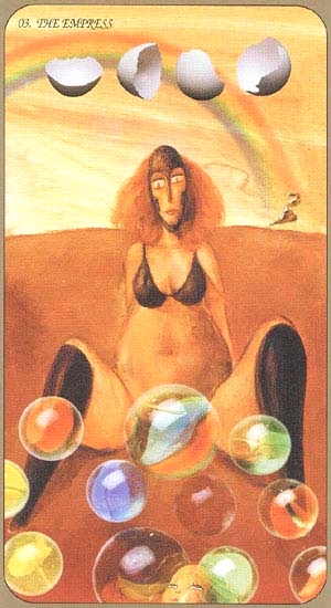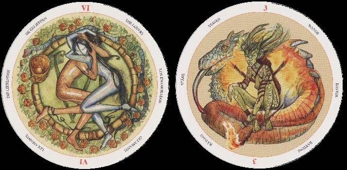 22nd Oct 2007 Lo Scarabeo have just issued a bunch of new decks. The Pictorial Key was very disappointing as the human figures were created using mannikins with a graphics program. This produces terribly static, awkward, expressionless figures. They used this technique earlier with their Tarot of Elves with no success. Their Tarot of Angels is much better as at least the art is created as paintings. Their Tarot of Pirates is in good saturated colours and is a relatively fine themed deck. In my opinion, the best of their recent issues by far is the Circle of Life Tarot. This is yet another round tarot, but this is not what especially distinguished it for me. The artwork is wonderful and coherent. It seems that here the artist Alessandro Starrantino was allowed to let his imagination flow without too much editorial direction. Too often, recent Lo Scarabeo decks seem over-produced and edited into blandness, but with the Circle of Life Tarot we have some real lively creative artwork.