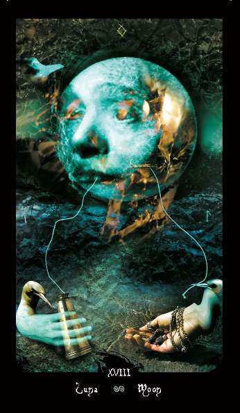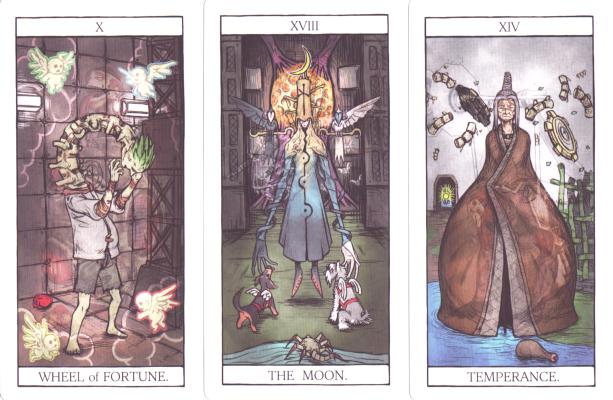 27th July 2007 A few days ago I received a rather remarkable tarot issued with the Sony Playstation computer game Baroque from Japan. This is called the Malkuth Tarot and is a majors only deck. The imagery is complex and inventive. There is a background picture on each card over which the main foreground image is layered. It is difficult to make out these background images but it is a rather good effect. Some cards are quite conventional, the Fool and the World, for example, but others provide powerful and often disturbing images. These may be connected directly to the scenarios in the Playstation game. The Wheel of Fortune is perhaps the most surprising image, showing a strange figure whose neck vertebrae extend out to form a circle. He reaches out to grab his head with his hands. This is, surely, a unique envisaging of the Wheel of Fortune. The Moon is also totally weird, with a central female figure wearing a tall hat, her hair seeming to merge with her coat, and her elongated arms reaching down to the two winged dogs at her feet. Temperance is a strange, seeming sour and distant, older woman, wrapped up in a cloak. She seems to have abandoned the vessels she usually pours into one another, and around her dispassionate form seem to fly parts of the spinal column, in the form of three connected vertebrae. Possible this all makes sense within the context of the computer game, but these images are puzzling and entirely unique. This deck is well worth acquiring for its engaging and enigmatic artwork. My mind enjoys mysterious images!