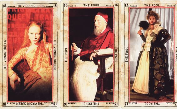 When I first came across this deck a year or so back, I thought it was just a pin-up, semi-erotic tarot, but now I have managed to buy a copy, I found a printed card enclosed which describes the origin of this deck. This game of tarot was produced by an organisation in France called Nord Solidarité. This was set up in 1992 to help the victims of disasters, but it seems to have quickly focused on a single issue, assisting the victims of the Chernobyl nuclear disaster. One of their activities was to give children from the Chernobyl area a summer holiday in France, to bring them out of their contaminated world and to return to them a little of the life that has been stolen from them. A similar Chernobyl Children’s Project exists in the UK. The women members on the committee agreed to pose for the creation of these tarot cards in order to raise funds. This reminds me of The Alternative Womans' Institute Calendar of 2000 in which members of the rather staid UK Womans's organisation posed naked for a calendar to raise money for Leukaemia research (the well known Calendar Girls film was loosely based on this). I am unable to find a date for the Dames de Coeur ('ladies of the heart') deck so I do not know if this French group came up with the idea first or if they were following the UK WI. 12th June 2007 Usually I am rather conservative regarding what I consider as a tarot deck. For me it has to have most of the conventional aspects, with the Major Arcana, even though diffently named, to some extent recognisable as tarot images. Just occasionally I find myself tempted by some 'Tarot' and justify buying it (to myself) on the basis that it might have some significance in the social history of modern tarot. Thus I bought the Cher Tarot some years ago and just a few others like that. Last week I found myself tempted by the promo deck for the film Elizabeth. The Elizabeth deck consists of 18 large cards made to look like an old French deck. The artwork consists of stills from the film which have been made to look like paintings, seemingly by using one of those art effect filters found in Photoshop, Paint Shop Pro or some other similar graphics program, and is rather professionally done. The 18 cards are not titled with the tarot attributes but instead bear the names of some characters in the film. In no way is this a tarot but it does mimic or draw on tarot imagery, so it has found its way into a small niche in my collection.