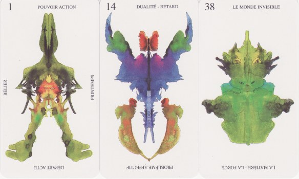 14th Oct 2007 I have been so busy recently with my other publishing activities that I have had little time to add any entries to this weblog. During the last week I have been in touch with some further artists regarding publishing their tarots and our discussions all seemed rather successful so I fully expect these will become part of the Art Tarot series in due course. I am now ready to undertake the final work on a new tarot by a Lebanese artist. This should be ready in November depending on my workload and how quickly I get the custom made boxes from the company that makes them for me. I have a number of tarots I bought over the past weeks a bit delayed in the post, but I expect they will all arrive en masse after the weekend. The Phantomwise Tarot has received a good response. I am so taken with Erin McCauley's art style that I have commissioned her to do a painting for me (not on a tarot theme). 2nd Oct 2007 I don't usually buy card sets that do not have a definite tarot structure, but I was recently tempted by ABC de l'encromancie. Now Encromancy is the telling of fortunes by examining inkblots. The creator of this set of cards Uma Mukanda has taken Rorschach type inkblots (folded paper) using various coloured inks as a starting point and then drawn outlines on the various shapes in order to give them some clear form. This produces an interesting series of images. There are 78 in all, which made me hope they had some tarot structure, but this is not the case.