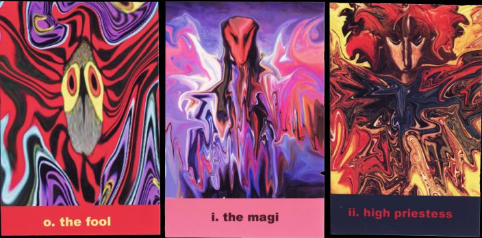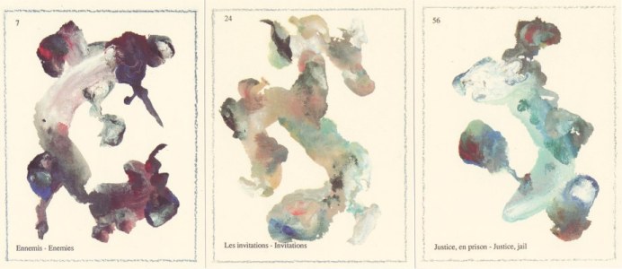 These images remind me of the Astrella Tarot Divinitoire, a set of 61 cards produced by the medium Yves Buquet using paintings by Isebies Chessex. Chessex's work appears to be large watercolours painted very wet so that the washes smear and flow into each other. They create effects similar to marbling.